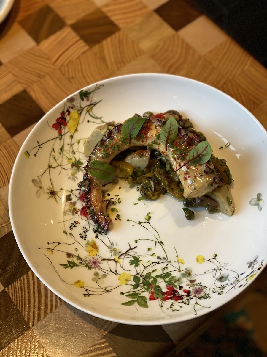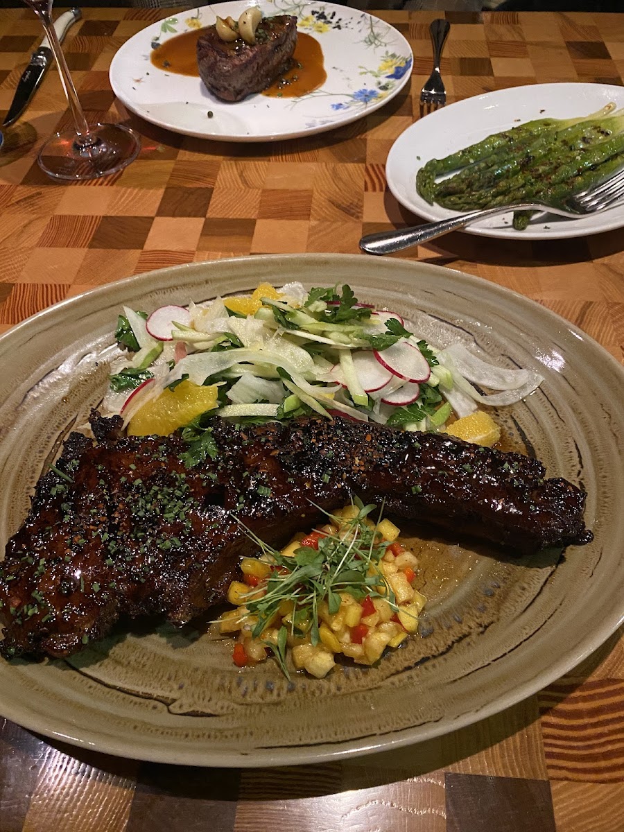 Everything was super delicious and the vibe was very nice while still allowing for a bit of a casual dress. The cococut walnut old fashioned is yummy and smooth. For apps, we got the grilled octopus and the spicy tuna tartar. Very good. For our mains we got the tomahawk pork chop and bone in short rib. Also, fantastic. The pork chop was sweet but not overly. The short ribs were melt in your mouth. The only thing lacking which did dock some stars was the "sharable" asparagus. It was like 5 thin sticks. Not really a sharable for the price if you ask me. Maybe we should have just got the asparagus appetizer that everyone is raving about. I suspect it would be the same amount of asparagus but with egg and ham also, at a better price point. Over all, definitely worth the dine. You should try for yourself. We were not disappointed. Valet parking here as part of a hotel, but there's parking available nearby with a short walk.