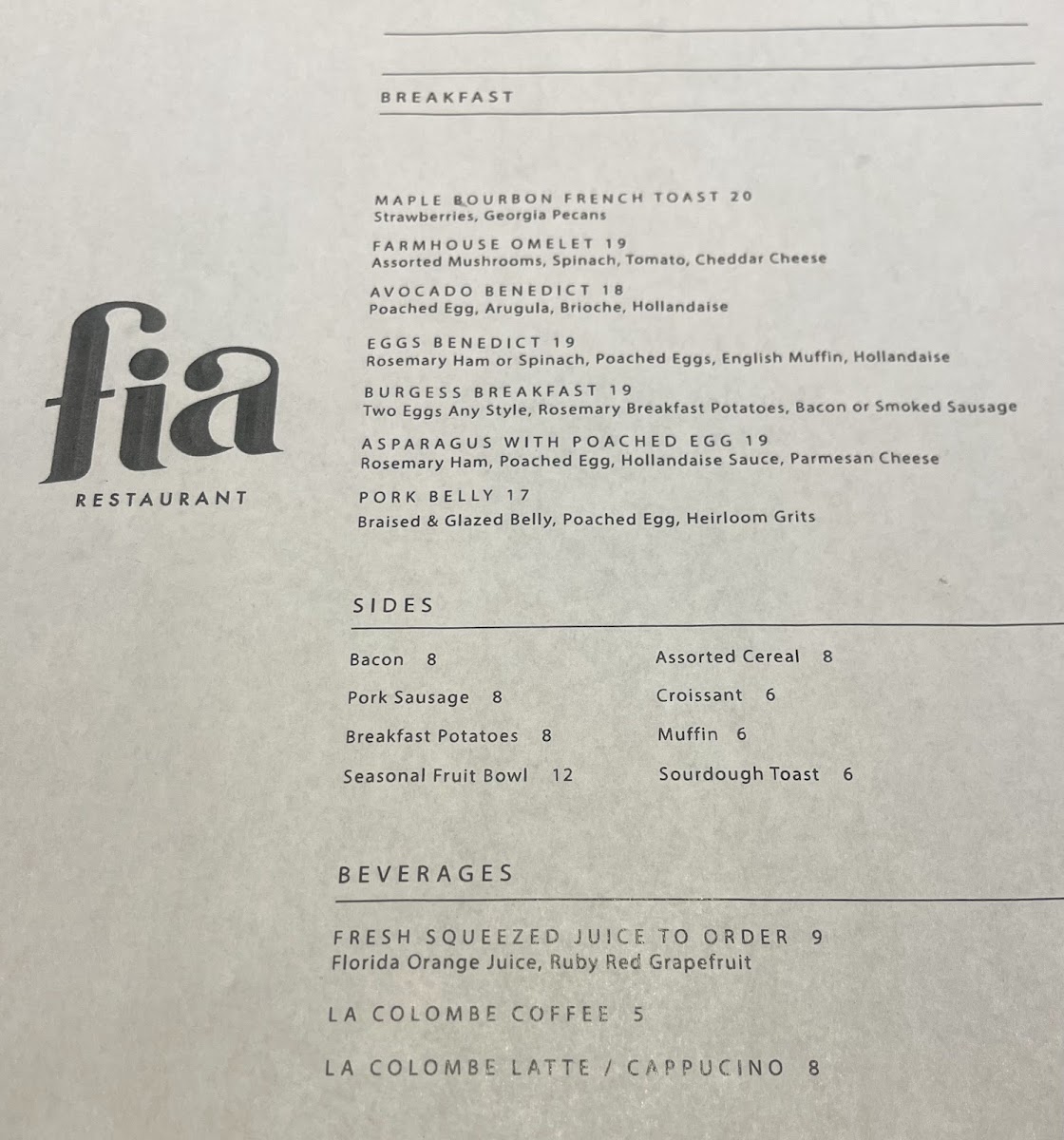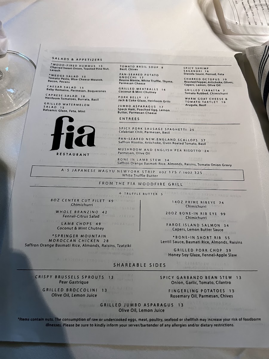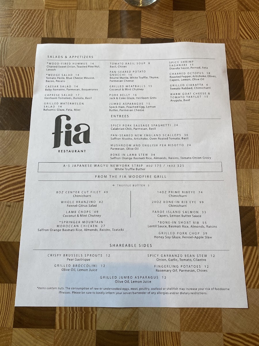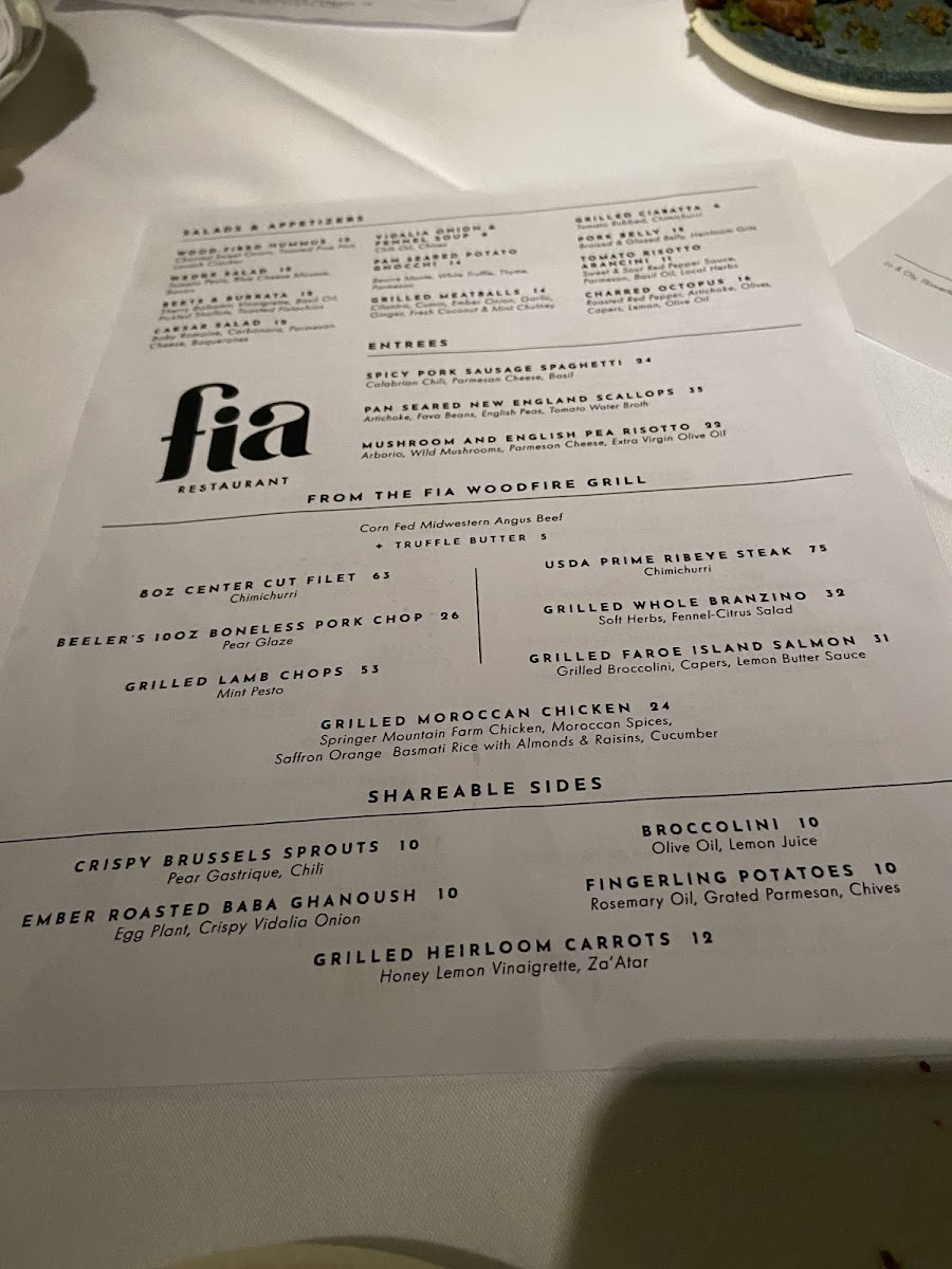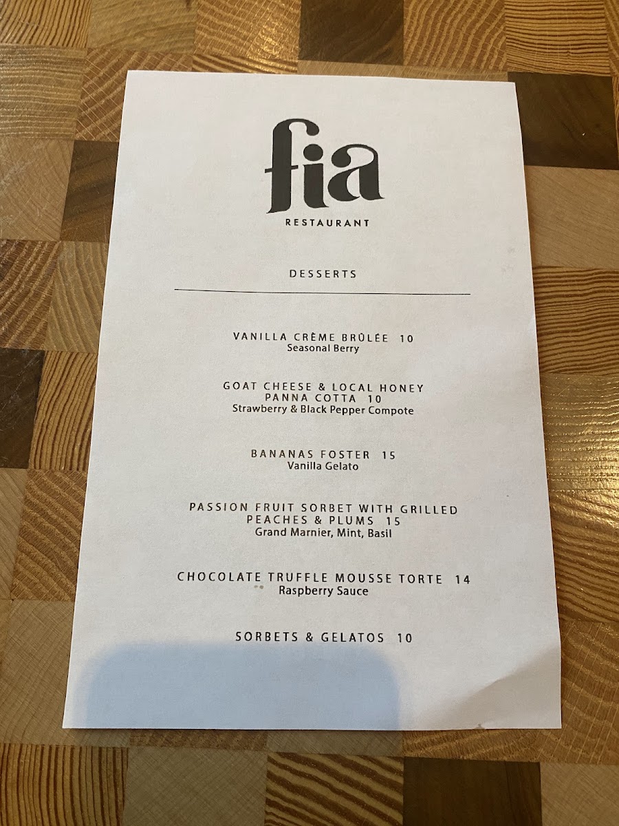 Fia Restaurant Menu